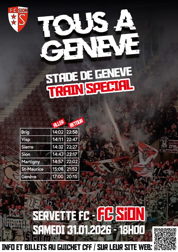 Les supporters valaisans se déplaceront en nombre samedi soir au stade de Genève. En effet, un train spécial a été organisé pour se rendre au bout du Lac, dans lequel un stock de 600 billets sera mis à la vente. Rajoutez à cela tous les supporters qui entreprendront le déplacement par leurs propres moyens, le secteur visiteur devrait être bien garni. Les horaires du train spécial sont à retrouver ci-dessous.